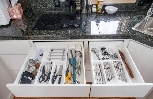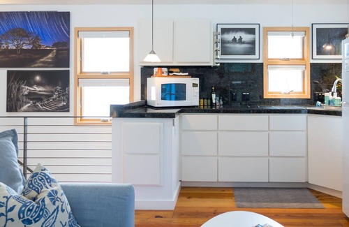 Located just north of The University of Texas, this modern studio showcases how green building can coexist with a historic landmark, the Fruth House. Designed as a photography gallery, creative use of space achieves a spacious feeling. Completed in February 2012, it incorporates “green building” concepts: LED lights, solar panels, efficient heating/AC, and tankless water heater. A queen-sized Murphy bed, fully-equipped kitchen, and comfy furnishings on a century-old reclaimed wood floor provide visitors with a home base to explore Austin. Approximately 450 sq. ft. of air conditioned space plus a 70 sq. ft balcony with chairs and table. Centrally-located, guests can catch the UT shuttle (75 yards), or walk to UT (1 mile), Central Market, and nearby restaurants along the “Drag” (Guadalupe) and in Hyde Park; we are near several hospitals (Austin Heart, Seton, St. David’s, University Medical/Brackenridge, and Dell Children’s) and the Capitol. UT scholars, visitors, sports fans, athletes (especially rowers!) and live music aficionados—all are welcome to enjoy our Gallery House.