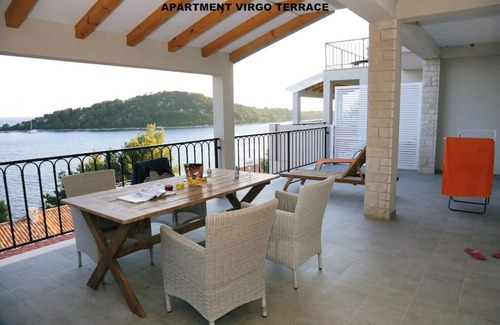 Apartment Virgo is a large size (65m2) accommodation with the large terrace and 180 degree sea view, shared swimming pool, modern kitchen, Wireless internet access, satellite TV, air conditioner, washing machine, etc..