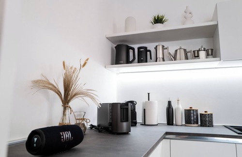 1 TV with various apps (Netflix, etc.) in the living room/kitchen; wireless speaker; kitchen with fridge, induction hob and oven, dishwasher, microwave, Nespresso coffee machine, moka pot, kettle, toaster, milk frother, teapot; washing machine, drying rack, vacuum cleaner, hairdryer; table, chairs and deckchairs on the balcony; iron and ironing board.