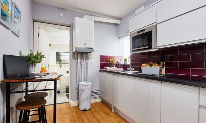 Modern 1 bed studio, Full Kitchen, dedicated work space.