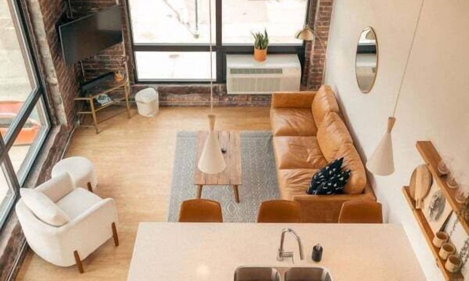 → LOFT The 535 sqft space was finished in 2020. It has a wall of floor to ceiling windows and soaring ceilings making this loft airy, elegant and modern. It has been thoughtfully designed with the solo traveler or adventuring couple in mind. This corner loft features views of the urban Lincoln Park Craft District from the top floor.