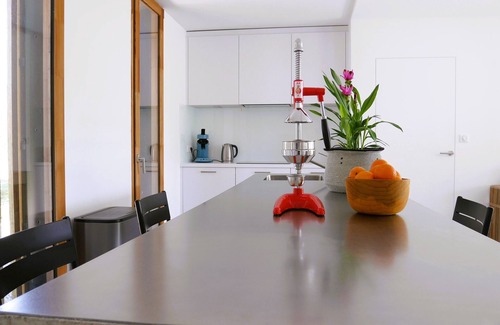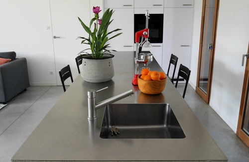 We offer you a modern architect-designed house in ecological timber construction that harmoniously combines design and nature. Enjoy the spacious living room with direct access to the terrace and garden through elegant sliding glass doors. The fully equipped kitchen and open-plan dining area invite you to cook and linger together. A desk with high-speed fibre optic internet and monitor/TV is available for working in a creative environment. The house has two identical bedrooms with a view of the garden and two bathrooms. One of the bathrooms is equipped with a bathtub, the other with a walk-in shower. So you can relax in peace and enjoy your privacy. You can sit back and relax on the terrace with dining area and sun loungers or refresh yourself under the outdoor shower. An outdoor plancha and two nearby tennis courts complete the offer. This idyllic home is perfect for nature lovers and design enthusiasts.