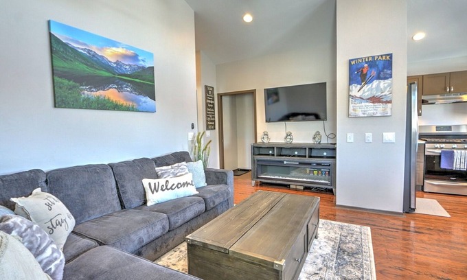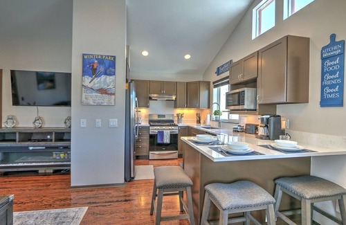 This recently remodeled modern apartment features a fully equipped kitchen with new appliances, open living space and ample windows overlooking fantastic mountain scenery. The kitchen is well equipped with everything needed to prepare a delicious meal. Enjoy a morning cup of coffee at the breakfast bar or cozy up around the fireplace with a glass of wine after an adventurous day.
