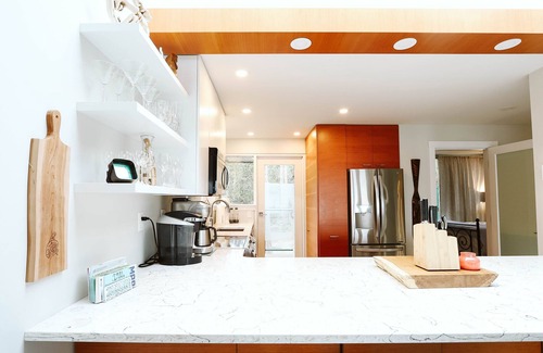 The living area has modern yet cozy furniture, with many seating options making entertaining easy. The Queen Cabinet bed with comfortable memory foam mattress is great for extra guests or kids. There is a large screen TV with free Netflix, Prime and Cable The floor to ceiling picture windows to fully capitalize on the view furnished with gorgeous motorized roller shades, and a great deck that enjoys morning sun and killer views of Stuart Channel.