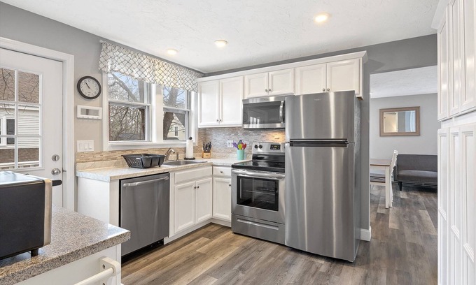 You'll enter to a fully stocked modern kitchen with a dishwasher and various appliances i.e. refrigerator, stove, oven, microwave, toaster oven, coffee maker, and blender. You'll have all the kitchen equipment you need with plenty of drinking glasses, mugs, dinnerware, and cutlery - along with plenty of pots and pans and kitchen essentials. We provide plenty of bath towels and bed sheets for all sleeping arrangements, along with a welcome kit that has starter supplies for your stay such as: shampoo, conditioner, body soap, a fresh wrapped sponge, and dishwasher pods.