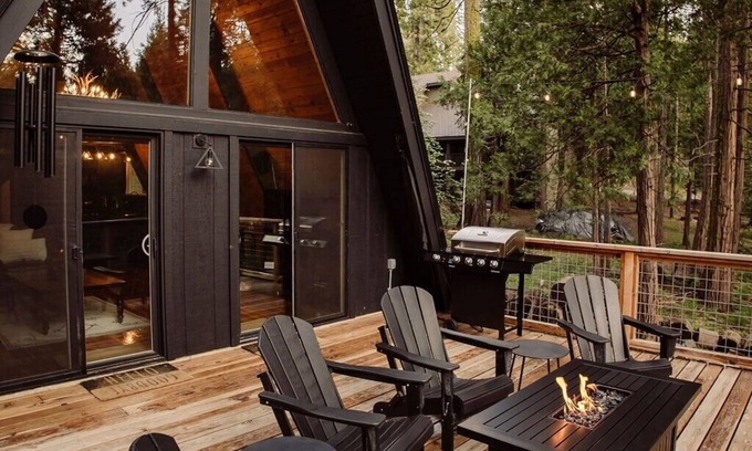 At the Modern Black A-Frame, you have access to the entire cabin (1,100 square feet) with 2 bedrooms, 2 full bathrooms, kitchen, dining, and living spaces. You'll find a BBQ, designer fire table, Adirondack lounge chairs, and multiple umbrellas on our spacious outdoor redwood decks.