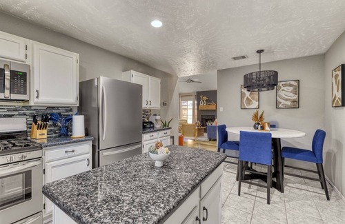 Relaxation for the whole family in this stylish home. Thoughtfully designed with all members of the family in mind. Pet friendly with fully fenced back yard and carpet free. This home is fully equipped with everything you'll need for an exceptional experience. Three comfortable bedrooms with televisions in each and a king size bed in primary suite. Peaceful neighborhood in northwest Houston just minutes away from amazing shops, dining, and entertainment.