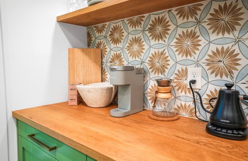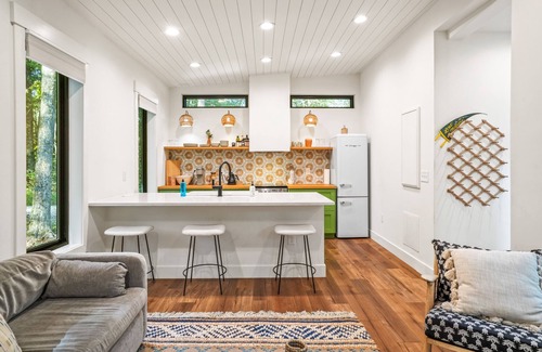 Step into 540 sq ft modern cabin with California-inspired boho design and experience playful color and fun features like a blue retro fridge. Top of the line countertops, flooring, tile, and plumbing fixtures create a luxury experience inside while surrounded by the beauty of untouched wilderness.