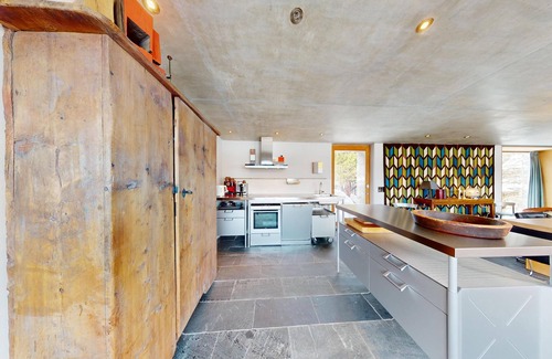 Spacious, very modern living/dining area on the upper floor with fireplace, TV and internet. Modern kitchen with oven, dishwasher, Chicco d'Oro- capsule coffee machine, pantry with large fridge and freezer compartment, dining table and stairs to the outside area.