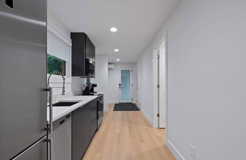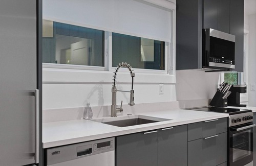Fully equipped kitchen: Modern appliances with an oven, refrigerator, microwave, Keurig coffee maker, and all essentials.