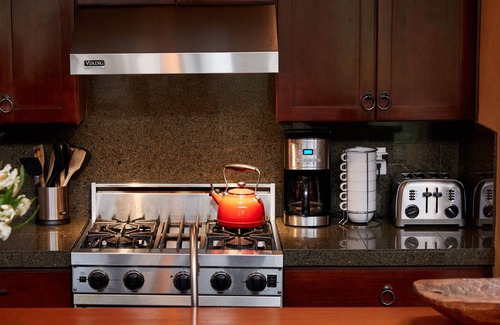 The home is all on one level - no stairs of any kind (except the exterior stairs down to the hutub) King bed in the master and two queen beds in the guest rooms - all plush pillow top beds with very comfy sheets and down comforters.