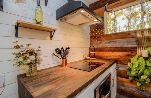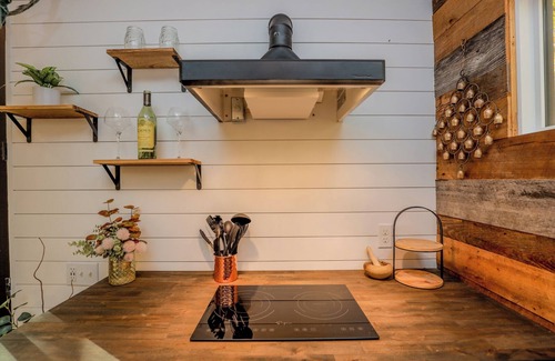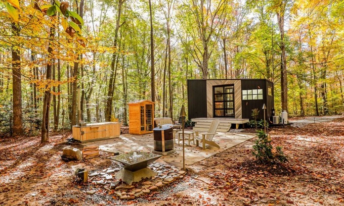 Tiny House with a full kitchen, Bathroom, Loft with a super comfortable bed, amazing natural light with tons of windows. An outdoor living space straight from a magazine with a huge patio, water feature, an outdoor projector for a movie night, Firepit/pizza oven combo, Cedar wood burning hot tub, and a private Sauna with Chromo Light Therapy.