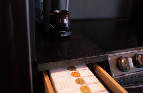 Inside, the home has a full kitchen with an oven, stove, full-size fridge, dishwasher, sink and plenty of cookbooks to serve as inspiration. A microwave is tucked in the pantry, and we provide coffee with Nespresso pods for your convenience.
