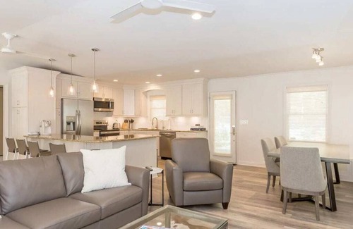 This single-story family-style home boasts 2 Bedrooms (1 King & 1 Queen). Just under the windows in the Grand Room is a high-end, Italian Natuzzi leather Queen-sized Sleeper Sofa (very comfortable – we have all slept in it several times). The huge open-concept living room, kitchen dining room, breakfast room, and wet bar is ideal for gathering - more seating than you could ever need making the living space never feel small. All making this a wonderful, one-of-a-kind, romantic, get-away vacation home for a quiet couple’s retreat or a fun activity-seeking family.