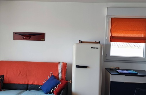 In the living room, you will find a coffee table, a comfortable 2-seater sofa bed (140x190) and a low cabinet with TV, mini Hifi system and floor lamp;