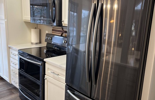 The kitchen has quartz countertops and new appliances and stocked with every tool and utensil you will need to cook a gourmet meal for the entire family, including a crock pot, blender, mixers and electric skillet and a mobile bar for mixing cocktails.