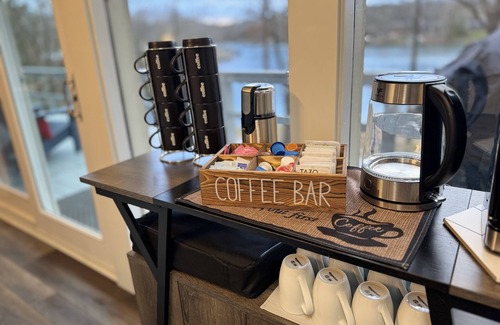 The second floor has another cozy bedroom with a queen bed, next to it another living room with a queen sleeper sofa and a warming electric fireplace and large tv, a coffee bar and some added video games for all to enjoy including a video arcade game with over 13 different games. The downstairs bathroom has a walk-in shower.