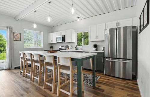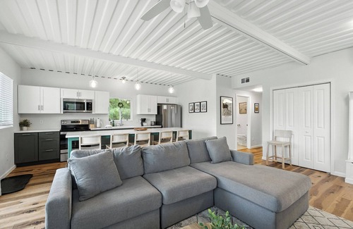This cozy retreat comfortably accommodates up to 8 guests across 2 bedrooms and features a range of amenities designed for relaxation and enjoyment. Enjoy the open layout with a well-equipped kitchen, Smart TV for streaming your favorite shows, and a charming front patio where you can gather around the fire pit for starry evenings. The property is dog-friendly, allowing you to include your furry friends in your celebrations. With high-speed internet, central heating and cooling, and a dedicated workspace, you can also seamlessly blend work and leisure during your stay.