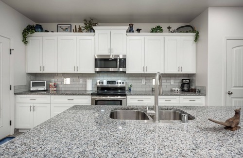 Enjoy modern comfort in this recently built townhome located minutes from Old Historic Mesilla, the Las Cruces Convention Center, New Mexico State University and highway access! Fully stocked kitchen for all your cooking needs (including a high chair), single car garage with additional driveway parking, washer/dryer and refrigerated AC are just a few of the amenities in this cozy place! Granite countertops throughout the home, Wifi and two smart TVs for your use and the primary suite is situated on the downstairs floor, along with a conveniently located half bathroom near the front entry. A comfy guest bedroom with 2 single beds, and another guest bedroom with a full bed and a pull out futon along with a full bathroom are upstairs. No pets are allowed. There are movies to watch and also games provided for your entertainment! Ring camera on property.