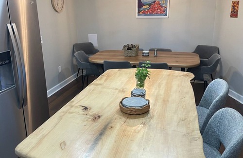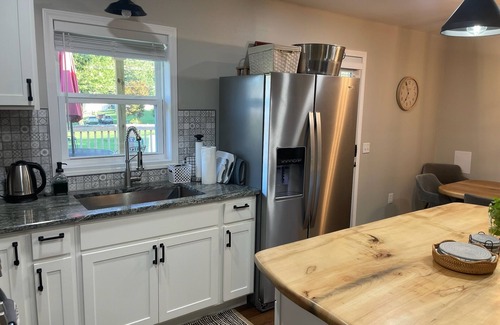 This elegant abode boasts a perfect blend of modern comfort and rustic charm❤️The open concept living area allows you to unwind in style with comfortable seating and tasteful decor. Brand new, top of the line appliances in the fully equipped kitchen. Cozy bedrooms with brand new furniture beckon with comfy beds and elegant furnishings. On the delightful deck, you can enjoy your morning cup freshly roasted Chantal Company coffee ☕️ ⭐️.