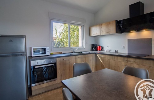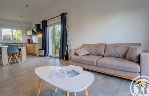 The accommodation, entirely on one level, consists of a large living room with a fully equipped modern kitchen opening onto the dining area and living room, a bedroom with a 160cm x 200cm bed, a bathroom with a large walk-in shower and vanity, and a separate toilet. The second bedroom is located in the living room on a high-quality 140cm x 190cm sofa bed. Outside, a large terrace accessible from the living room allows you to enjoy meals outdoors and barbecues during the summer.