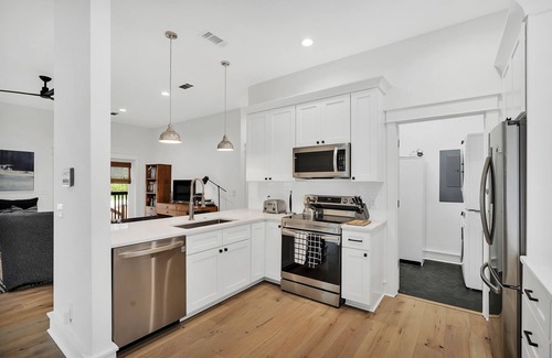 Through the side entryway, you'll find an open floor plan living-kitchen-dining space. The light and bright finishes with plenty of windows and two sets of french doors to bring in the light from outside!