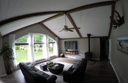 Non smoking 3 Bedroom, 1.5 Bathroom, fully equipped kitchen, huge open concept living room (perfect for entertaining) with a 75' Smart TV. Free High Speed internet. Sandy water located across the road with your own dock. Swimming, floaties, paddle boat and a canoe awaits you!!