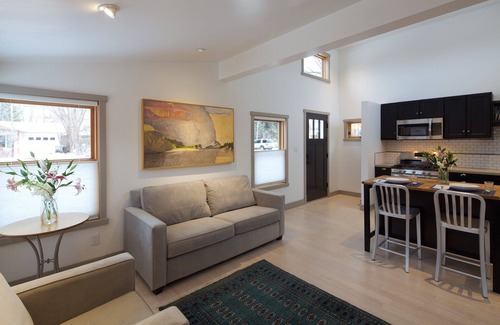 The Artists' Cottage on the corner of Eight and Euclid was completed in December of 2015 and has over 600 square feet of bright south facing living that accommodates two to three guests (additional nightly charge for 3rd guest). The cottage is a free-standing building separate from the owners’ house and has its own parking, entrance, flagstone patio, small yard and view of Mt Sopris. With a vaulted ceiling, gas fireplace and bamboo floors the cottage is a warm contemporary space to spend a few days or a few weeks. A separate bedroom with a queen bed, blackout blinds and high thread count linens guarantee a great night’s sleep. A hotel style twin size roll-away bed is available to be set up in the living room for a third guest. The bath has a walk/wheel in shower and a separate room with commode and washer/dryer. The kitchen is fully equipped with gas convection range, microwave, dishwasher, refrigerator, toaster and both a multi-cup and single serve coffee makers and all the utensils and serve ware needed to prepare and serve meals. There is an attached storage area for skis and other sporting equipment. Cable TV and free WiFi allow guests to stay connected. While the cottage is not ADA compliant, it has no stairs and is fairly accessible depending on an individual’s needs. Please inquire for more detail about accessibility.