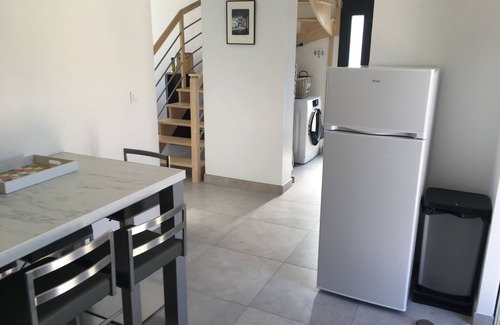The COTTAGE: 4 star Gîtes de France rating. New (2017 construction) comprising 2 bedrooms on the upper floor, each with a double bed (1.4x2m) in solid oak and its own balcony. The ground floor and the private pool (16m long) are wheel-chair accessible. A fully-equipped kitchen & a double sofa-bed are on the L-shaped ground floor. There are two wet-room style shower rooms, one on each floor, the downstairs one including a WC; upstairs, the WC is separate. TV (French and British), free WiFi; dishwasher, washing machine, Nespresso coffee machine; hair dryers in each bedroom. Two private parking places right outside a private entrance. Shaded gas barbecue with table/6 chairs (30m2); LaFuma armchairs and padded sun loungers around the pool/terrace.