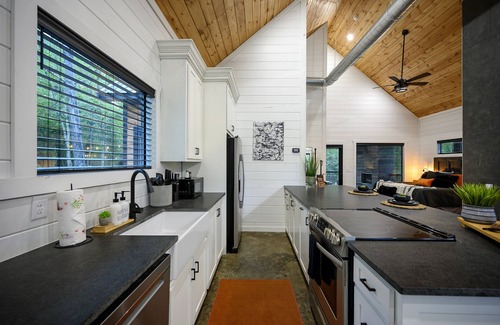 As you enter, you will see an incredible floor to ceiling fireplace that divides the large kitchen and living areas from the bedroom. The kitchen has an oversized island with granite countertops and is fully stocked with high quality cookware and appliances perfect for cooking your own meals. Windows through out for the beautiful natural light to filter in and provide natural scenic views. Large flat screen TV and gas fireplace (not available April 1-Oct 1) to enhance the vibe. Master bedroom features king size bed and full bath with double shower heads and soaking tub. Access to back patio with hot tub and firepit.