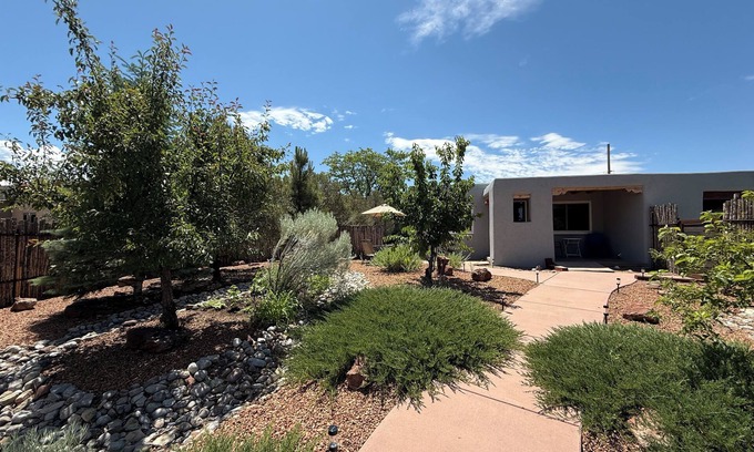 Casa Comodo is comfortable and modern with all of the essentials and amenities. The large yard wraps around the house and is fenced with stucco and coyote fencing. Fruit trees, native plants and pine trees line the yard. Enjoy coffee on the covered front porch and grilling under a large "portal" in the evening. The kitchen is outfitted with a Bosch suite of appliances. It is also equipped with Caraway cookware and bakeware. The spice cabinet is stocked! Full dishware and glasses provided. There are 3 bedrooms. The 3rd is an office. The master is a King and 2nd bedroom is queen both with new Casper beds and bedding. There is an inflatable bed for the office that is queen size. The views are lovely with great star gazing at night. The location is 0.9 miles from the plaza. The Santa Fe River Trail is just around the corner. Also, the Rec Center with tennis courts and a pool is 2 blocks. Just around the corner is the Solano Shopping Center with La Montanita Co-op organic grocery. There is a Kelly's liquor store and multiple restaurants from Sushi, Mexican, and Pho to Better Day coffee and a great new local gastropub. Come experience Santa Fe. Pets are welcome with deposit.