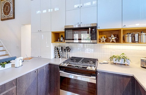Inside, lofty ceilings and generous windows fill the cottage with light. There's a contemporary kitchen with sleek cabinetry and stainless steel appliances (including a gas stove), a breakfast bar for when you're not dining alfresco, and a living room with a cozy sectional and a smart TV. Both bedrooms - one upstairs, one downstairs - have smart TVs as well. Additional features of the house include a private washer/dryer and complimentary WiFi.