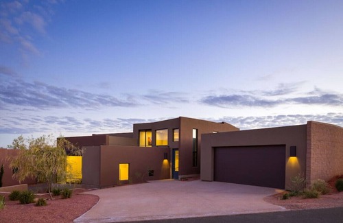 Modern desert dwelling in Kayenta Utah. Enjoy the night sky and peaceful surroundings. Amazing views of the red rock cliffs. This is a two bedroom two bathroom suite with a king bed and two queen beds. Full kitchen and living room. Three 50in smart tvs. Wireless internet. Two car garage. Enjoy hiking, biking, and lake activities right outside your door. Take it easy at this unique and tranquil getaway. Discount for weekly & monthly bookings.