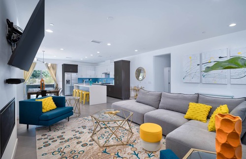 Imagined by seven cousins, Seven Palms Desert Oasis, or SPDO as we like to call it, is a spacious modern desert marvel custom-designed with its own uniquely themed bedrooms – The Black & White Room, The Desert Sun Room, The Classic Palm Springs Room, and The Fun Room. Built with an open and airy entertainment, dining and kitchen area, the home boasts original modern art, colorful decorations and all the necessary amenities you desire.