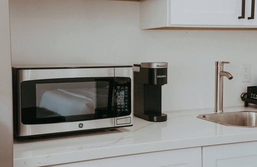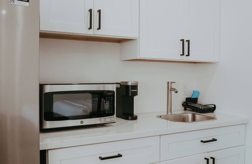 Step into our open-concept studio featuring one bathroom, thoughtfully designed to comfortably accommodate up to four guests. Unwind in the plush king-size bed or utilize the double sofa sleeper for additional sleeping arrangements. The space boasts moderate kitchen amenities, ideal for preparing simple meals or assembling a delightful charcuterie board. Whether indoors, lounging around the TV, or outdoors, relishing the serene atmosphere on the deck with cozy patio furniture encircling the inviting firepit, relaxation is guaranteed. The deck is a shared space with the adjacent unit.