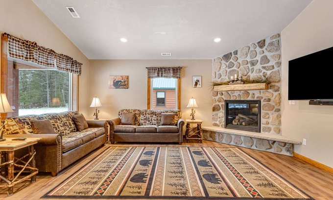 Upon entering the cabin, a bright interior and a cozy atmosphere greet you throughout the well-appointed living area. Enjoy the whimsical, natural theming throughout the space - from the decor to the rustic and modern furnishings. Relax and make yourself at home by resting on the plush furniture, streaming a movie marathon on the large TV, or curling up with a good book before a glowing fire in the grand stone fireplace. The open-concept floor plan was designed with togetherness in mind so that no conversation would be lost. Prepare grand meals or quick snacks for your outdoor adventures in the sophisticated eat-in kitchen, boasting brand-new appliances, ample cupboard room, and a formal dining table. Host barbecues or sip your morning coffee on the patio while listening to the tranquil sounds of nature.
