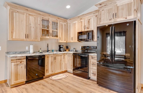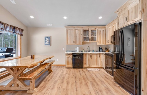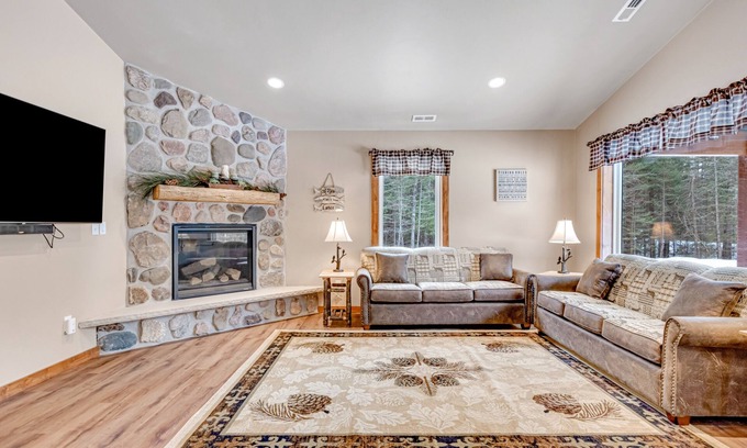 Upon entering the cabin, a bright interior and a cozy atmosphere greet you throughout the well-appointed living area. Enjoy the whimsical, natural theming throughout the space - from the decor to the rustic and modern furnishings. Relax and make yourself at home by resting on the plush furniture, streaming a movie marathon on the large TV, or curling up with a good book before a glowing fire in the grand stone fireplace. The open-concept floor plan was designed with togetherness in mind so that no conversation would be lost. Prepare grand meals or quick snacks for your outdoor adventures in the sophisticated eat-in kitchen, boasting brand-new appliances, ample cupboard room, and a formal dining table. Host barbecues or sip your morning coffee on the patio while listening to the tranquil sounds of nature.
