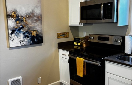 Your stay at the Base Camp Studio includes a range of thoughtful amenities designed to enhance your experience. The spacious 516 square-foot layout features a luxurious king-sized bed, a full bathroom, and a well-equipped kitchen, where you can prepare meals together as newlyweds. Enjoy modern conveniences like a washer and dryer, a cozy dining table, and a 42-inch smart TV equipped with Netflix and Prime capabilities. For extra guests, a twin air mattress is also available, making it easy to host friends or family who join you in celebrating your nuptials. With keyless private entry and a designated parking pad just outside your door, you'll appreciate the seamless access and privacy that this studio provides.