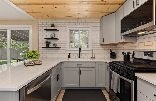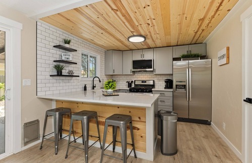 Inside, enjoy beautiful finishes, a spacious master suite with custom wood detailing, high-speed WiFi, and a cozy living room perfect for streaming or relaxing by the fireplace. The kitchen is fully equipped and features a stunning tile backsplash, stainless steel appliances, and everything you need to cook at home.