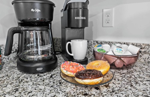 ▻ Kitchen with stove, oven, fridge, microwave oven, basic cookwares, drip coffee machine, Keurig machine, dishwasher