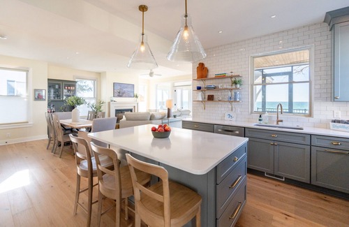 "Such a beautiful home with a stunning view! We especially loved the screened porch and sunroom on the main floor. The open kitchen floor plan makes it easy to socialize while prepping meals. The bottom floor worked well for the couple with a small child. The extra space downstairs was wonderful for her to have room to play. The upstairs bedrooms were quiet and comfortable. This made it nice if some wanted to stay up; they could, while others could go up and sleep away from any noise. The beach is just steps away, which made it so convenient. We had a magical weekend and will definitely return!"