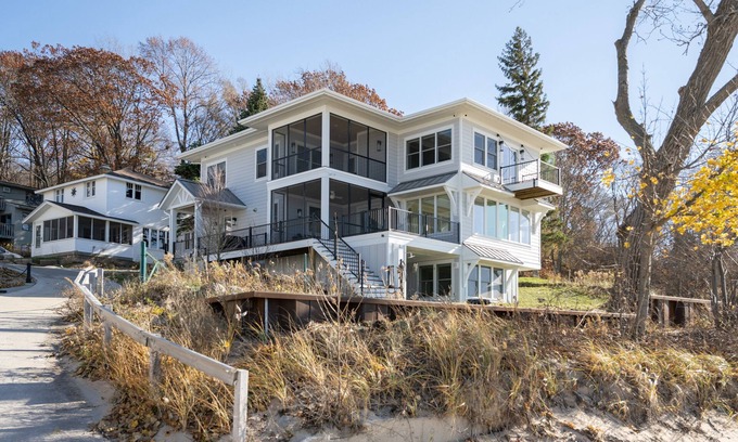 This picturesque vacation retreat is nestled in the heart of historic Mac Hills on the shores of Lake Michigan. This brand new, 4-bedroom, 4 1/2-bathroom gem is a three-story haven that combines timeless elegance with modern comfort.