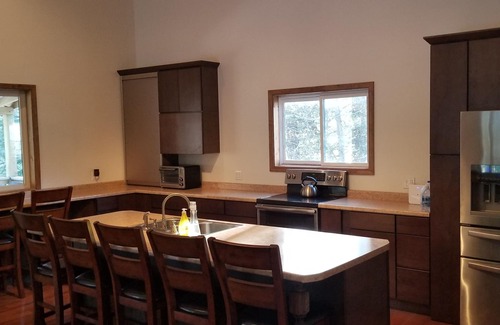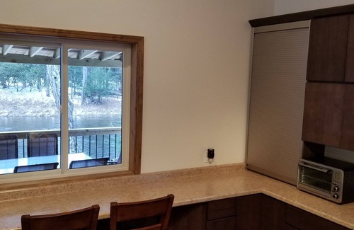 Sloped and vaulted, tongue & groove pine ceilings, uses dimmable recessed and track lighting, giving each room a feeling of openness and finesse. An allergy sufferers dream with hardwood floors throughout the entire bungalow. The kitchen is well designed with a large center island and numerous counter tops that invite gatherings and good times. Stainless steel appliances, include a large 4 door refrigerator, microwave, toaster oven, dishwasher, Keurig as well as standard coffee machines, and double oven with cooking range ensures you'll have the equipment necessary to entertain a small army. Sit and relax on the premium leather sectional with motorized recliners while looking out one of the many windows with great views of the river, mountains, woods, and a creek. The supersized living room is matched with a huge 60" Sony Bravia smart TV fully loaded with DirecTV's premium entertainment package.