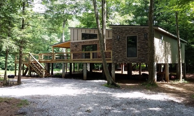 Modern architecture meets nature nestled in the heart of the Appalachian mountains. Built in 2016, this stylish house is located just 15 feet off the banks of the Shavers Fork river and only 6 miles from downtown Elkins. This 5 acre site houses an open design bungalow on stilts, offering guests the most unique abode Randolph county has to offer. Inside, the great room and kitchen invite entertainment, while the bedrooms offer quality space for relaxation. Unwind with flair and sophistication.