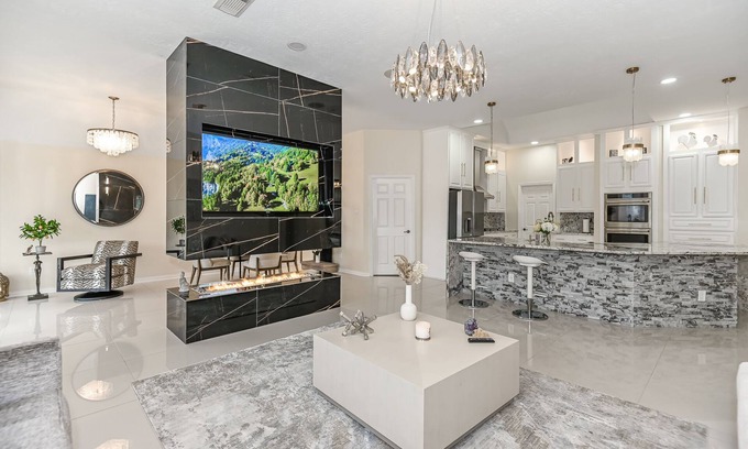 When you walk in, you are greeted with the entertainment space and then followed by that a gorgeous white custom designed kitchen that opens up to the modern spacious living room with big windows showcasing the lake, with a beautiful fireplace and TV mounted on top.