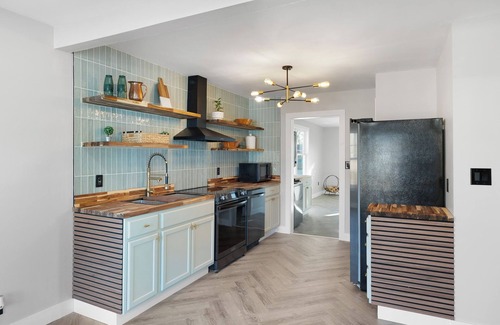 Fully Equipped Kitchen: Featuring acacia butcher block countertops, stainless steel appliances, and everything you need to prepare meals.