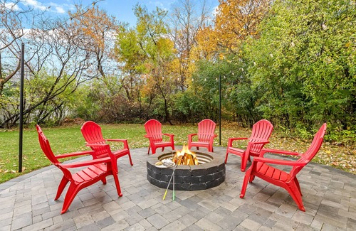 The VRBO features a brand new, paver patio with fire pit right off of the kitchen with Adirondack chair seating, chopped wood, s’more skewers and cozy Edison lighting- perfect for relaxing with your morning coffee, nightcap or making s’mores.