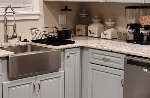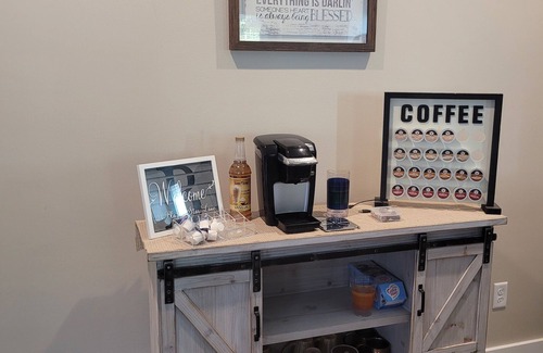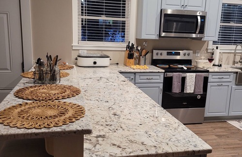 Immaculate Kitchen: Enjoy the farmhouse style kitchen equipped with a coffee and breakfast bar—ideal for preparing meals or snacks while you celebrate with loved ones.
