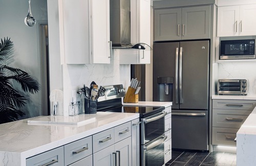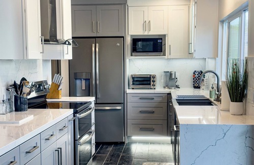* A completely redesigned, remodeled and partially open space kitchen! Unleash your inner chef with our brand new Carrera marble-like Quartz countertops, brand new stainless steel farmhouse kitchen sink, brand new solid wood modern Shaker kitchen cabinets with ambience lighting and our fully stocked kitchen, complete with Calphalon cookware, cooking utensils, dishware, a toaster oven, microwave, coffee maker and a suite of brand-new Stainless Steel appliances such as: the dishwasher, stove fan vent and refrigerator.