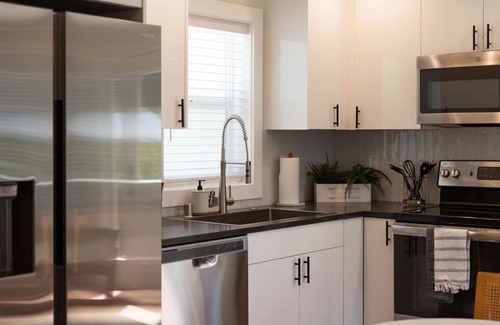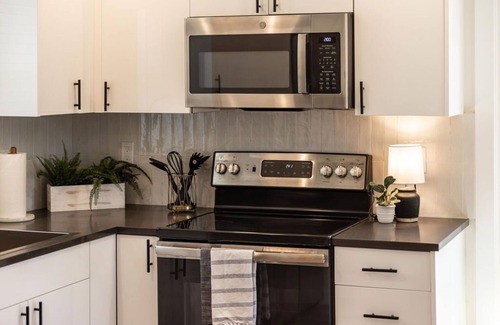 Large living space with large sleeper sofa, small 2-seater dining space, large bathroom with modern large shower. The kitchen features lots of counter space with large appliances, full size for this space. Ample kitchen supplies to stay in and cook!